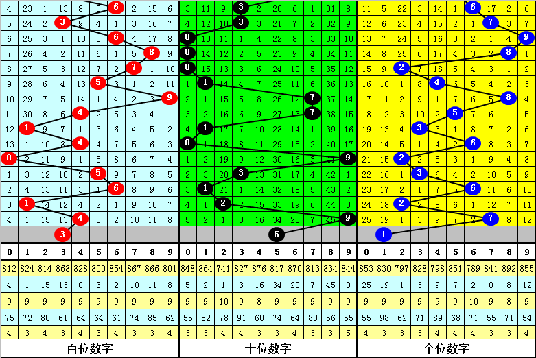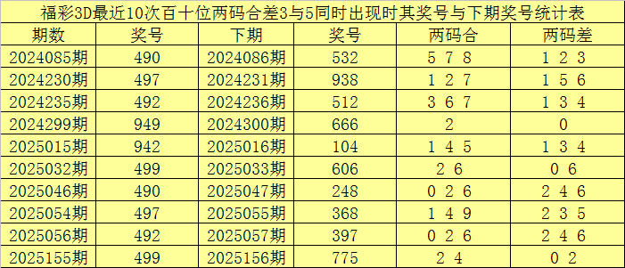 从以上统计可以看出,百十位两码合差3与5同时出现之后其下期两码合差表现最热的4个分别为:0126,本期百十位两码合差可以参考这四码中的数据。
