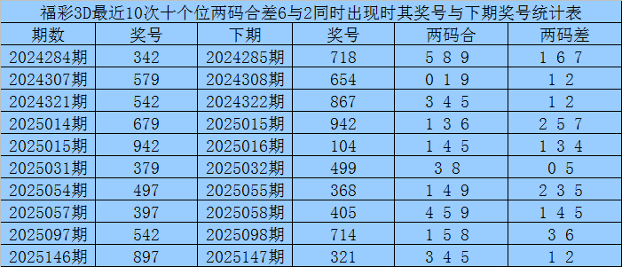 十个位合差分析:上期奖号十个位开出97组合,两码合为6,两码差为2,最近10次十个位两码合6与两码差2同时出现时,其奖号和下期奖号分别为:
