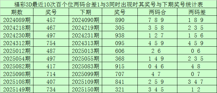 百个位合差分析:上期奖号百个位开出47组合,两码合为1,两码差为3,最近10次百个位两码合1与两码差3同时出现时,其奖号和下期奖号分别为: