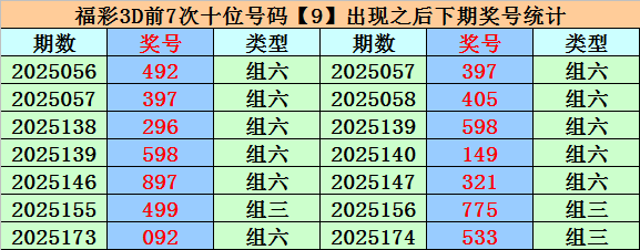 在十位开奖中,号码9前7次出现之后,下期奖号分别为:9、0、9、4、2、7、3,其中奖号大小比为3:4,012路比为4:2:1,奇偶比为4:3。