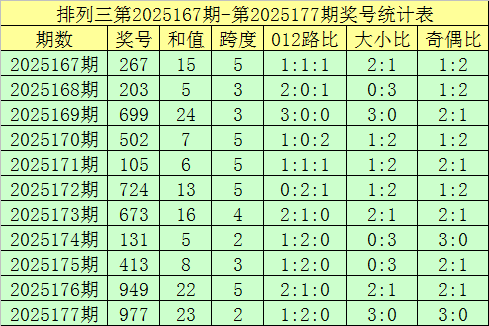 开奖回顾:排列三第2025177期奖号开出:977,组选类型:组三,大小比为3:0,奇偶比为3:0,和值为23,跨度为2。