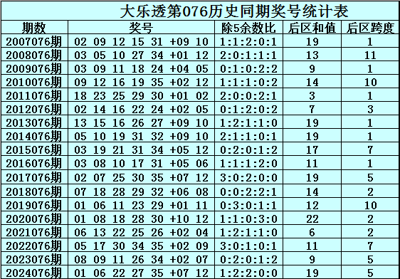 大乐透历年同期第076期前区奖号除5余数统计分析: