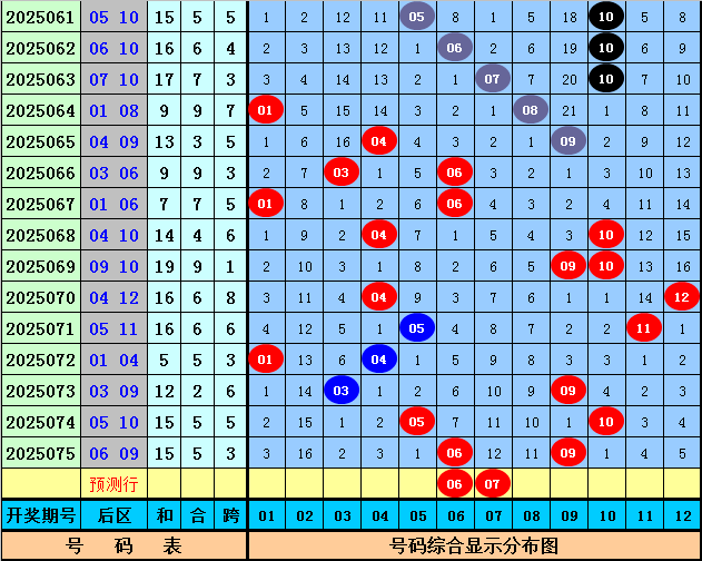 后区号码频次:在历史同期中后区号码03没有出现,奖号08、11开出1次,奖号04、06开出2次,奖号01、07开出3次,奖号05、09、10开出4次,奖号02、12开出6次,本期注意号码01、06、07、08、11。