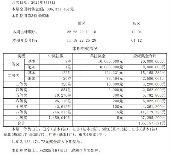 北京时间7月7日晚,体彩大乐透第25076期开奖,当期开奖号码为前区11 18 22 25 29,后区04 12。