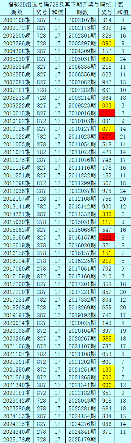 二、组选分析:历史上组选号码728开出了55次,其下期奖号分别为:314-392-826-090-152-699-218-623-942-631-864-003-111-081-077-777-518-428-746-178-452-567-978-758-930-330-117-547-222-521-151-212-702-210-358-857-804-659-746-143-397-585-782-053-601-133-700-606-351-918-684-834-086-371,其开出期数和下期奖号统计为: