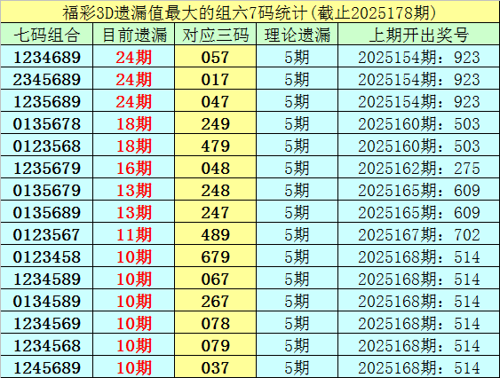 1.截止第25178期,七码组六遗漏最大的是:1234689、2345689、1235689,当前遗漏24期。