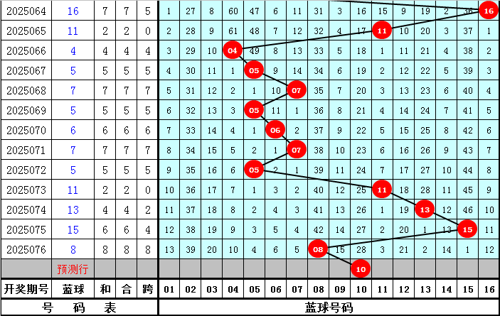 三、蓝球号码分析:最近10期分别开出蓝球:05、07、05、06、07、05、11、13、15、08,蓝球号码012路比为2:3:5,奇偶比为8:2,大小比为3:7,本期独蓝关注偶数号码,参考号码10。