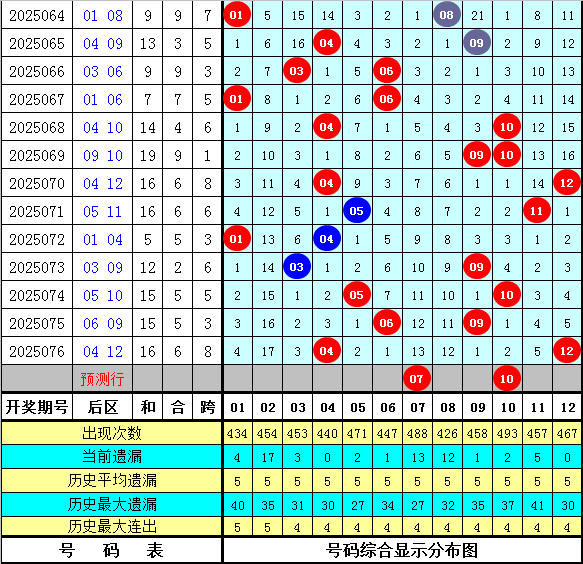 上期回顾:体彩大乐透第2025076期开出奖号11 18 22 25 29 + 04 12,其中前区奖号奇偶比为3:2,三区比为1:2:2,后区奖号奇偶比为0:2,大小比为1:1。