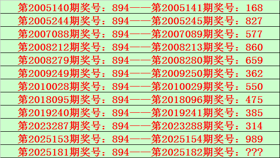 排列三第2025181期开出奖号894,该号码直选类型历史上出现了12次,前11次开出之后期下期奖号为:168、827、577、860、659、362、550、475、385、314、989,见下表: