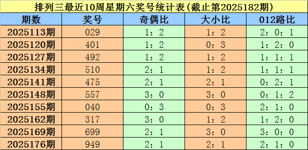 上期回顾:排列三第2025182期奖号为721。其中奖号奇偶比为2:1,大小比为1:2,012路比为0:2:1。