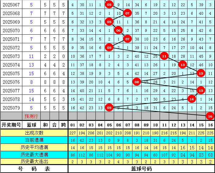 蓝球分析【一区01-04,二区05-08,三区09-12,四区13-16】:上期蓝球为05,出现在第二区,近50期区间比为11:14:14:11,近10期区间比为0:5:1:4,本期预计蓝球在第四区出现,参考蓝球16。