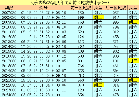 在大乐透第080期历年同期奖号中,前区后三位尾数出号频次分别为:尾数0、9出现9个,尾数1、4出现7个,尾数5、7出现5个,尾数3出现4个,尾数2、8出现3个,尾数6出现2个。其中尾数数字三类型豹子、组三、组六次数比为0:3:15,今年同期后三位尾数类型参考组六;