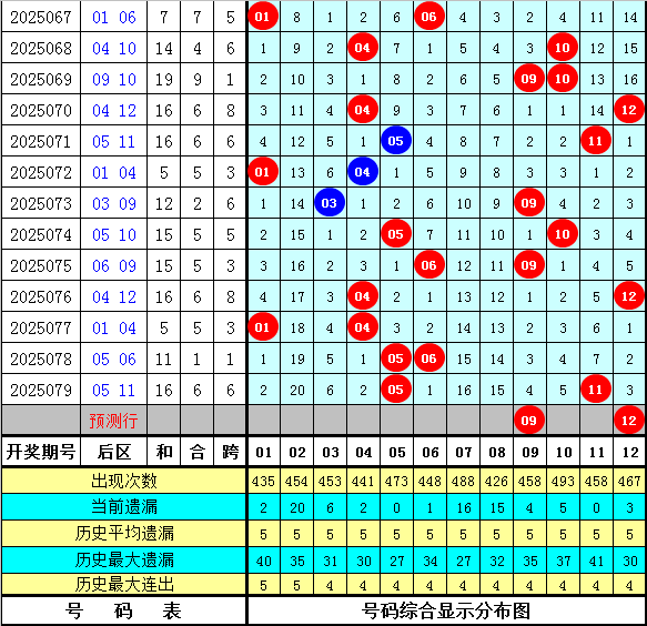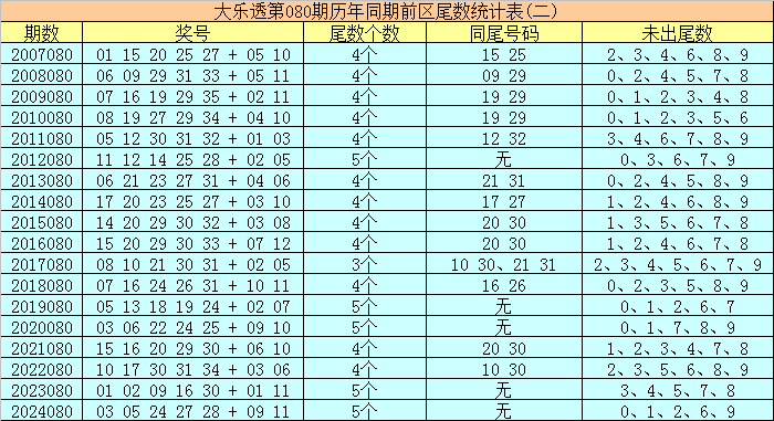 大乐透历年同期第080期后区尾数奇偶比为19:17,最近5年尾数奇偶比为6:4,后区尾数大小比为12:24,最近5年尾数大小比为4:6,本期后区注意号码01、03、09、10、12,后区两码关注09、12。