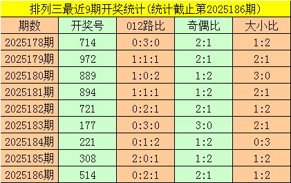 一、排列三第2025186期开出号码514,其奇偶比为2:1,大小比为1:2,号码012路比为0:2:1。该号码直选历史上出现了9次。