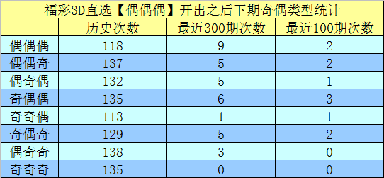 上期开出奖号402,其奇偶类型为:偶偶偶,该类型组合历史上开出了1038期,最近100期开出了12期。