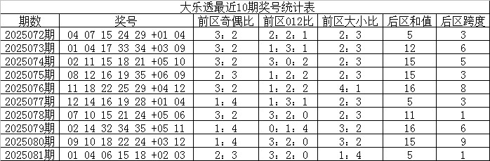 大乐透第25081期开奖,前区奖号:01、04、06、15、18;后区奖号:02、03。其中前区奖号012路比为3:2:0,大小比为1:4,奇偶比为2:3,后区开出2路+0路奖号。