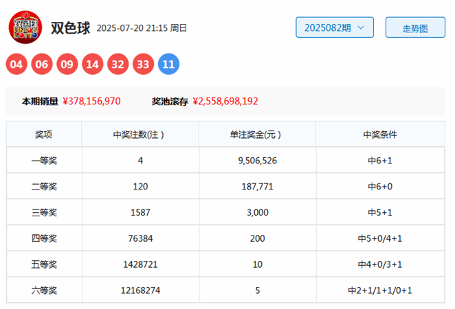 福彩双色球第2025082期奖号开出:04 06 09 14 32 33+11。其中红球三区比为3:1:2,和值为98,包含1个重号:06,包含连码组合32 33,蓝球为大号、奇数。