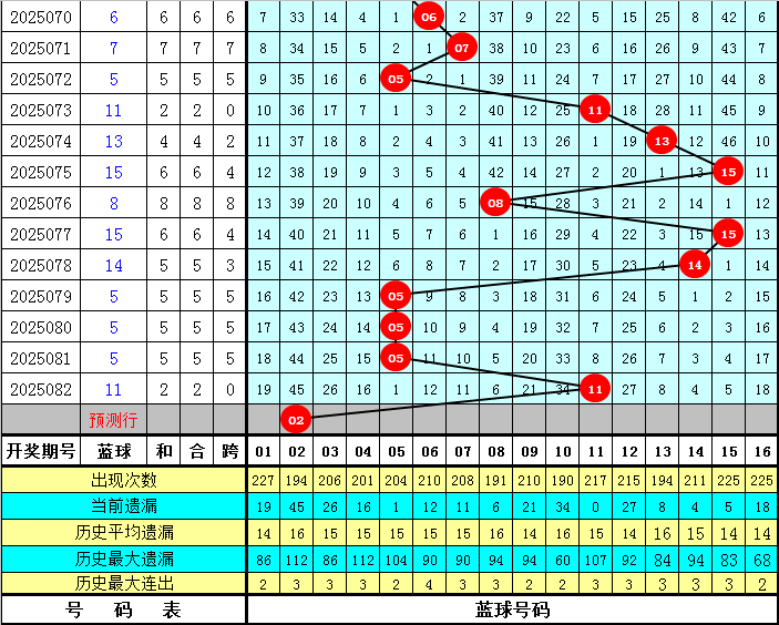 蓝球分析:上期蓝球开出大号、奇数11,近10期蓝球大小比为6:4,大号蓝球走势较热,蓝球奇偶比为8:2,奇数蓝球走势较热,本期预计蓝球为小 号、偶数,一码蓝球看好02。