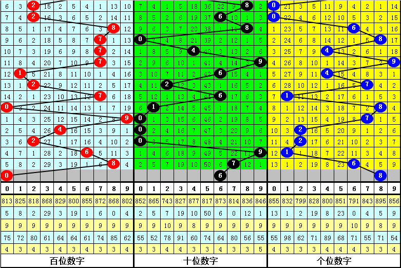 组选分析:在0-9的组选分布图中,最近10期0-2区段开出13个号码,3-6区段开出6个号码,7-9区段开出11个号码,上期0-2区段没有出号,本期看好各区间分别开出1个奖号。