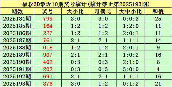 开奖回顾:福彩3D第2025193期奖号为:876。奖号类型为组六,和值为21,奇偶比为1:2,跨度为2,012路比为1:1:1,大小比为3:0。