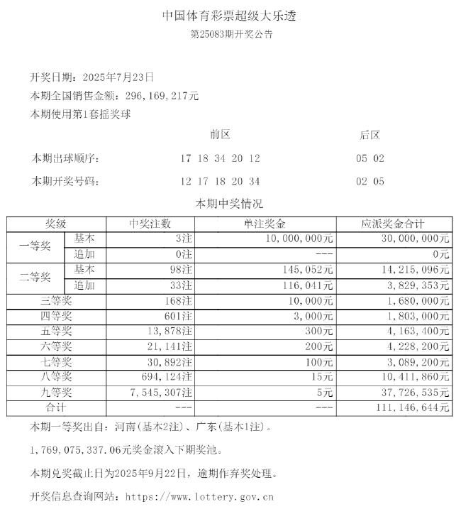 本期全国共开出3注一等奖,单注奖金1000万元,其中河南中出2注,广东中出1注。二等奖开出98注,单注奖金14.5万余元,其中33注采用追加投注,每注多得奖金11.6万余元。本期全国销量为2.96亿元,奖池方面,17.69亿余元滚存至7月26日(周六)开奖的第25084期。