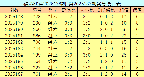 上期回顾:福彩3D第2025197期开奖号码为057,组选类型为组六,奇偶比为2:1,大小比为2:1。