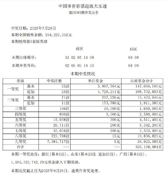 北京时间7月28日晚,体彩大乐透第25085期开奖,当期开奖号码为前区02 05 09 14 33,后区04 09。本期全国共开出25注一等奖,单注奖金590万余元,其中23注采用追加投注,每注多得奖金472万余元。