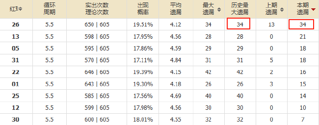 另外需要注意的是,红球26码目前已经遗漏高达34期,达到其历史最大遗漏值,更是远超其理论循环周期,未来可以格外关注26码的回补。