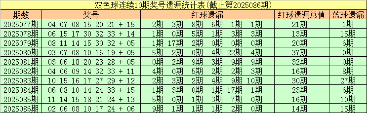 安队第2025087期双色球遗漏分析:(热码:遗漏0-3期,温码遗漏4-9期,冷码遗漏10期及以上)