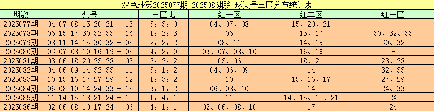 双色球第2025086期奖号为:02 06 08 10 17 24 + 06,红球三区比为4:1:1。