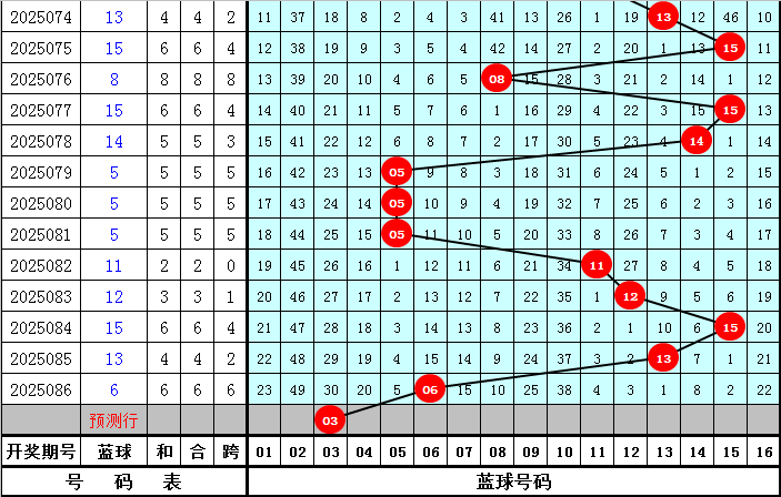 蓝球分析:第2025086期开出蓝球06,最近10期蓝球号码遗漏期数分别为:1期、15期、6期、0期、0期、8期、27期、6期、10期、15期,第2025087期蓝球注意02-08段出号,重点关注0路蓝球。第2025077期参考蓝球:03。