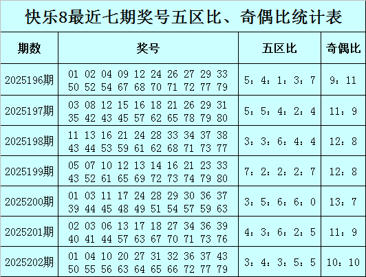 福彩快乐8第2025202期开奖回顾:01 04 10 20 27 31 32 36 37 43 50 55 56 63 64 65 66 72 77 79,其中奖号五区比为3:4:3:5:5,奇偶比为10:10,012路比为5:9:6。