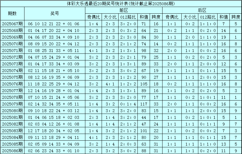 大乐透第2025086期开奖号码为:02、06、23、24、33+01、10。其中前区奖号奇偶比为2:3,大小比为3:2,和值为88,跨度为31,后区奖号奇偶比为1:1,大小比为1:1。