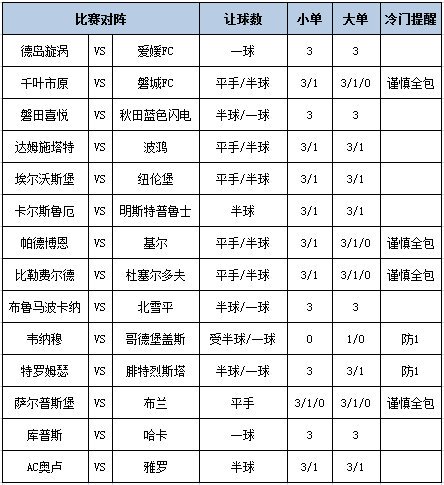3、磐田喜悦VS秋田蓝色闪电:磐田喜悦最近3个主场赢下2场,主场发挥不错;秋田蓝色闪电最近4个客场3胜1平,客场走势不俗。