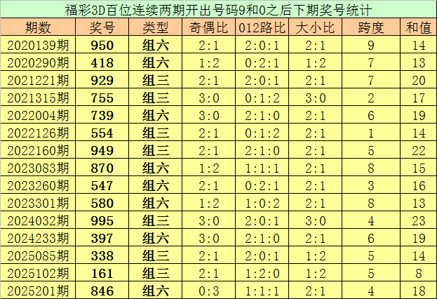 百位号码:连续两期百位出号分别为:9-0,历史上福彩3D连续两期前后分别出号9-0的奖号共出现71次。在百位9-0的奖号现象出现时,近15期下期分别出号:950-418-929-755-739-554-949-870-547-580-995-397-338-161-846;