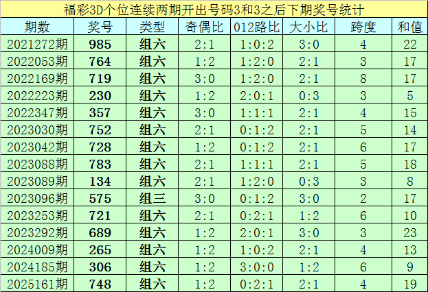 个位号码:最近两期个位开出号码为3-3,在福彩3D历史开奖中,前后两期个位分别开出号码3-3的奖号出现了86次。最近15期个位3-3组合出现之后,其下期奖号分别为:985-764-719-230-357-752-728-783-134-575-721-689-265-306-748;