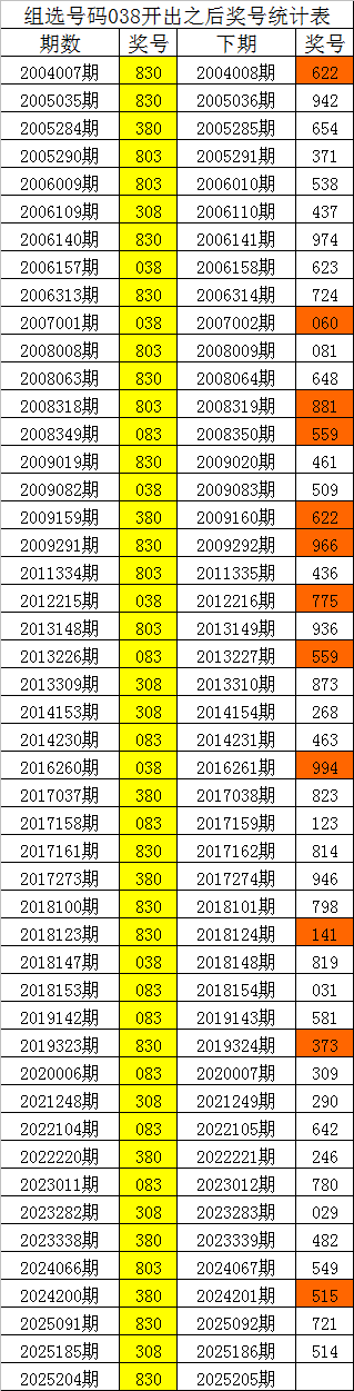 体彩排列三组选号码038历史上出现了48次,其下期奖号分别为:622、942、654、371、538、437、974、623、724、060、081、648、881、559、461、509、622、966、436、775、936、559、873、268、463、994、823、123、814、946、798、141、819、031、581、373、309、290、642、246、780、029、482、549、515、721、514,详细统计见下表: