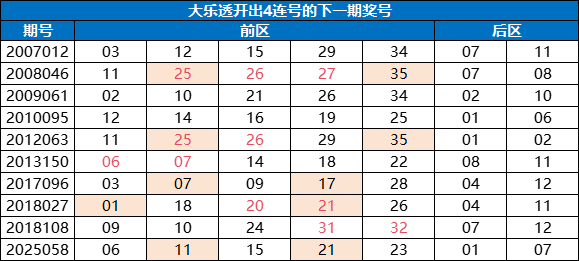众所周知,大乐透前区共有5枚号码,所以单期开出4连号的情况十分罕见。据小编回查,大乐透自2007年上市以来,过去2756期开奖中一共仅开出过11次4连号形态,开出概率仅为0.39%!此外,上次开出4连号形态是在今年的第25057期,当时也是时隔7年再次开出。