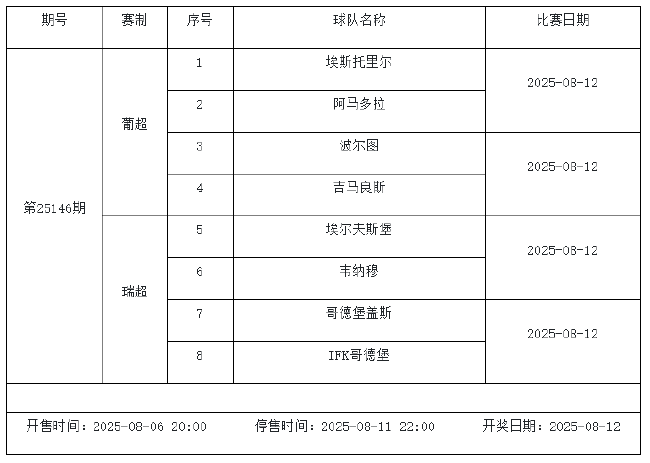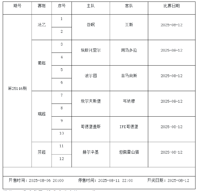 北京时间2025年8月6日,国家体彩中心发布了8月9日、8月11日足彩赛程调整的通知。具体赛事变化如下:第25109期14场竞猜荷甲海伦芬vs福伦丹入选,替换掉葡超波尔图vs吉马良斯,以下为具体赛程通知: