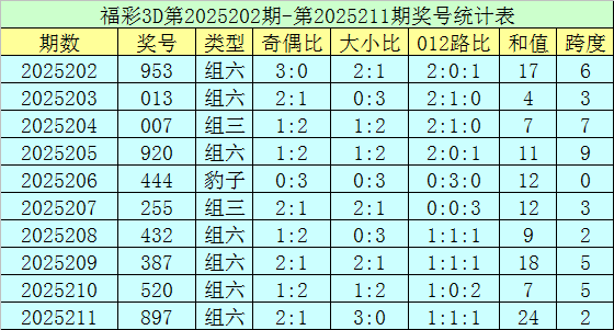 上期回顾:福彩3D第2025211期开奖号码为897,组选类型为组六,奇偶比为2:1,大小比为3:0。