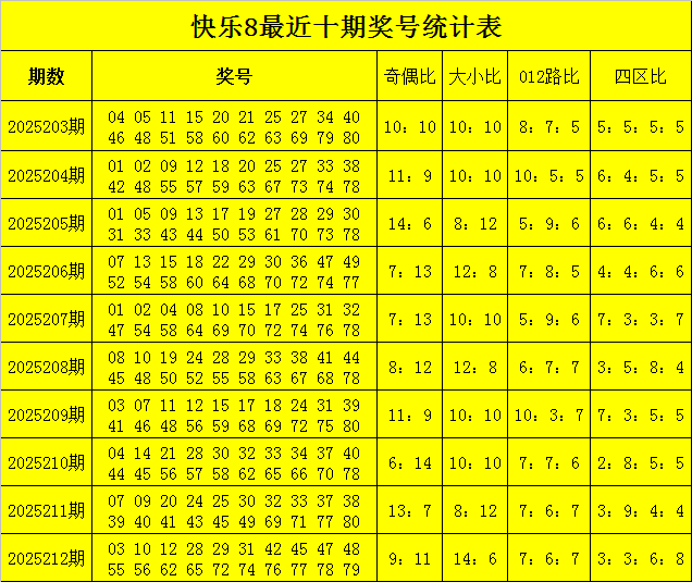 福彩快乐8第2025212期开奖回顾:03 10 12 28 29 31 42 45 47 48 55 56 62 65 72 74 76 77 78 79,其中奖号大小比为14:6,012路比为7:6:7,和值为989,跨度为76,奇偶比为9:11。