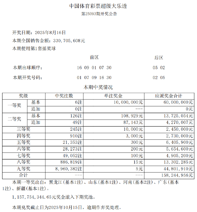 北京时间8月16日晚,体彩大乐透第25093期开奖,当期开奖号码为01 07 09 16 30+02 05。