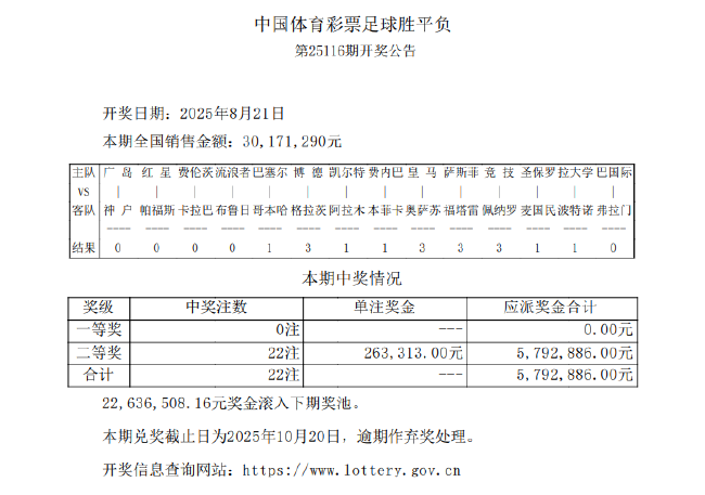 北京时间8月21日下午,胜负彩第25116期开奖结果揭晓。本期14场头奖空开,2,263万余元奖金滚入下期奖池,二等奖开出22注,单注奖金263,313元,任九开出97注109,177元。本期足彩销量为30,171,290元,任九投注总额为16,547,288元。