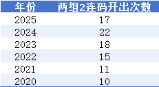 另外,除开两组2连码,三组2连码的形态也是颇有意思,在过去几年当中,这一形态曾出现过两次,分别在2021年的2021043期和2023年的2023011期出现过一次,刚刚好隔年开出,如今到了2025年,正好又相隔一年,今年或许还会再度开出这一形态。