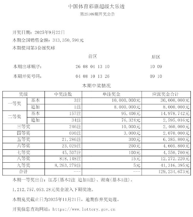本期全国销量为3.13亿元,奖池方面,12.12亿余元滚存至9月24日(周三)开奖的第25110期。
