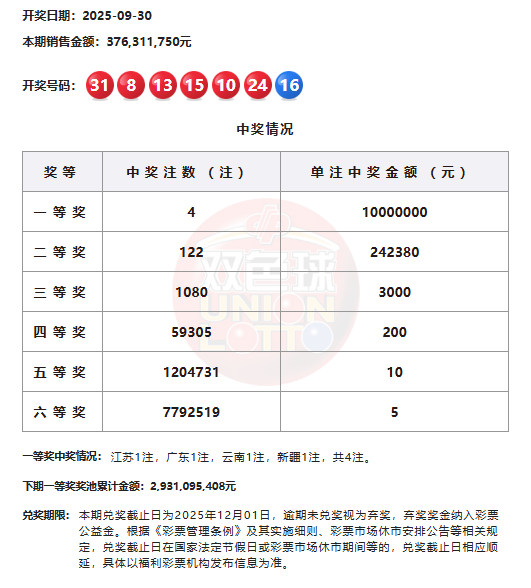 22:05 本期一等奖开出4注,单注奖金1000万元,其中江苏、广东、云南、新疆各1注。二等奖开出122注,单注奖金24.2万余元。本期双色球全国销量为3.76亿余元,计奖结束后奖池余额为29.3亿余元。