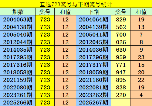 第2025266期3D奖号为:723,历史上该号码直选开出12次,下期号码分别为:829、562、700、026、630、959、771、947、895、838、220。