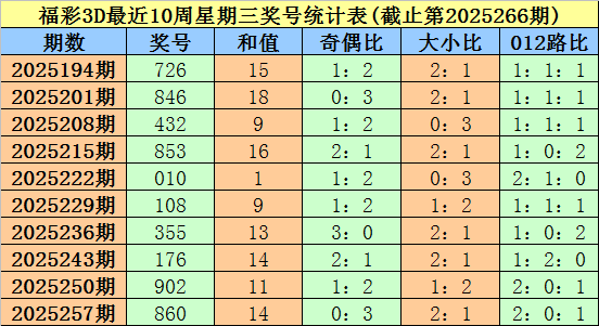 福彩3D第2025257期(上周星期三)奖号为860。其中奖号奇偶比为0:3,大小比为2:1,012路比为2:0:1。