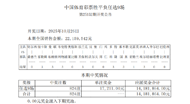 北京时间10月26日,胜负彩第25152期任九开奖结果揭晓。本期任九开出824注,单注奖金17,211元。本期任九投注总额为22,159,542元。