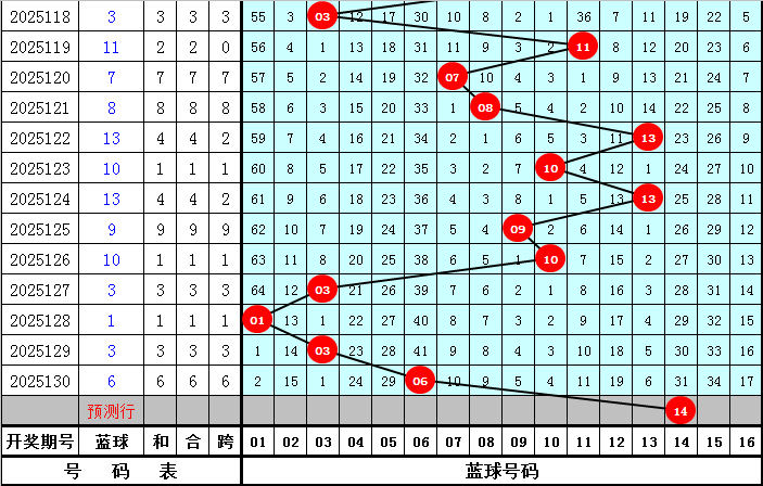 蓝球分析:去年第131期蓝球奖号为13,开出1路蓝球,目前2路蓝球轮空7年,今年同期适当关注2路蓝球回补,看好号码14。